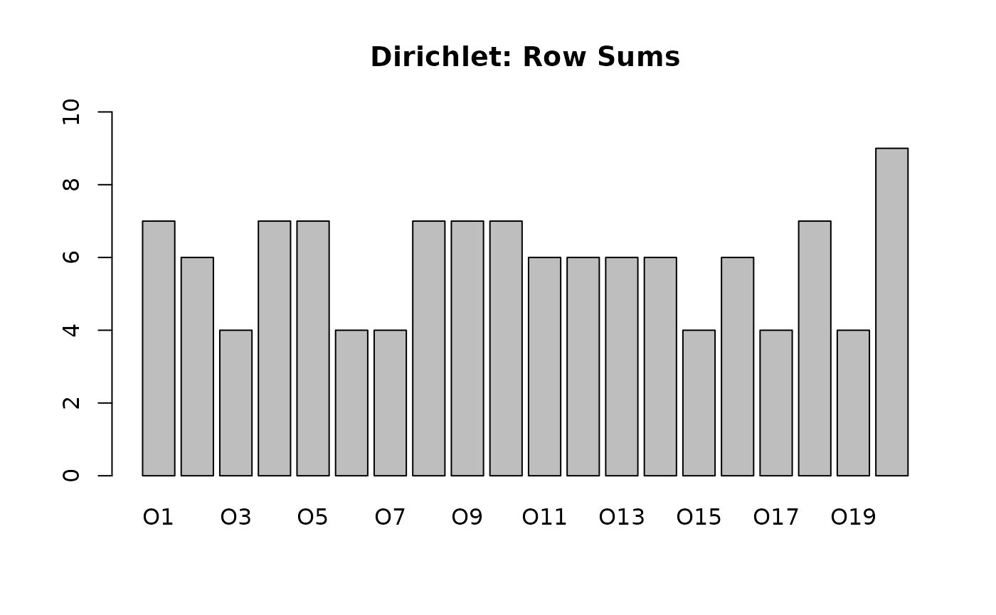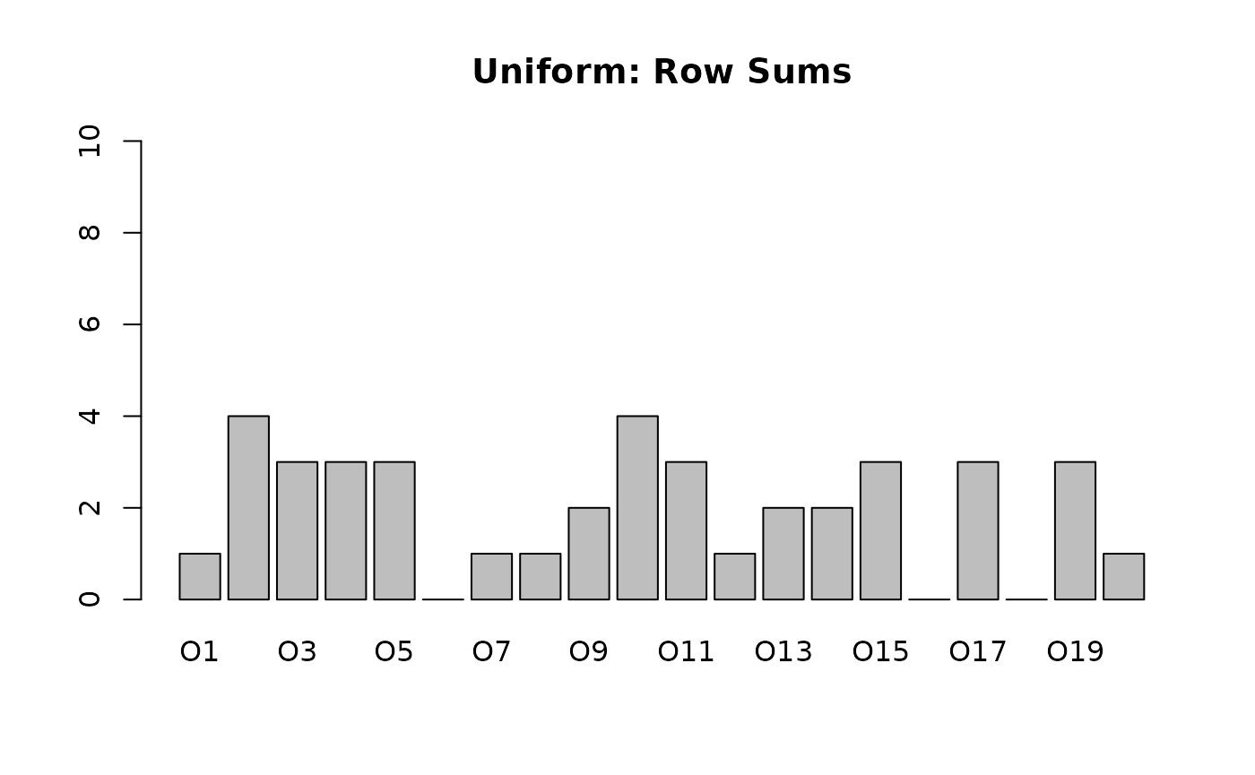 barplot(rowSums(fc_uni$incidence()), main = "Uniform: Row Sums", ylim = c(0, 10))